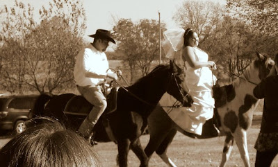 | Bride and groom leaving together. Esther did NOT go side saddle! |
